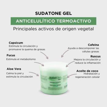 ¡Quema la grasa localiza con el tratamiento anticelulítico Sudatone en Gel! Formulada con activos Naturales que combaten la celulitis y reduce la grasa localizada. Tratamiento anticelulítico Termoactivo que estimula la combustión de grasas, reduciendo visiblemente la apariencia de la piel de naranja. Además, calma la inflamación y mejora la elasticidad de la piel, brindándote resultados visibles y duraderos.